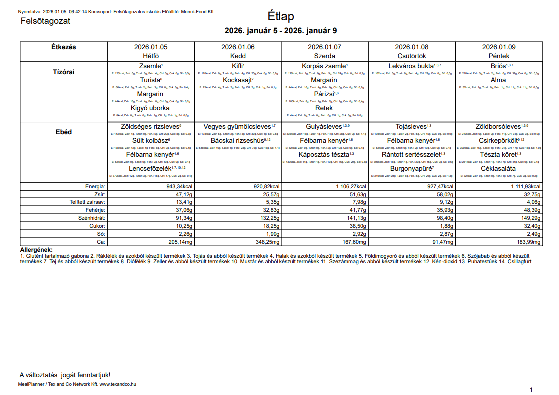 Étlap 01.05 - 01.09 kantin 2026. január 06. 0 hozzászólás A galéria nagyobb méretű képeinek megnyitásához kattintson az alábbi fotókra. Lapozásához használhajta a navigációs nyilakat, valamint billentyűzetének jobb és bal gombját. Étlap 01.05-01.09.png Hozzászólások
